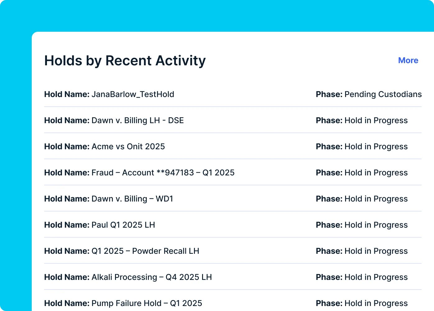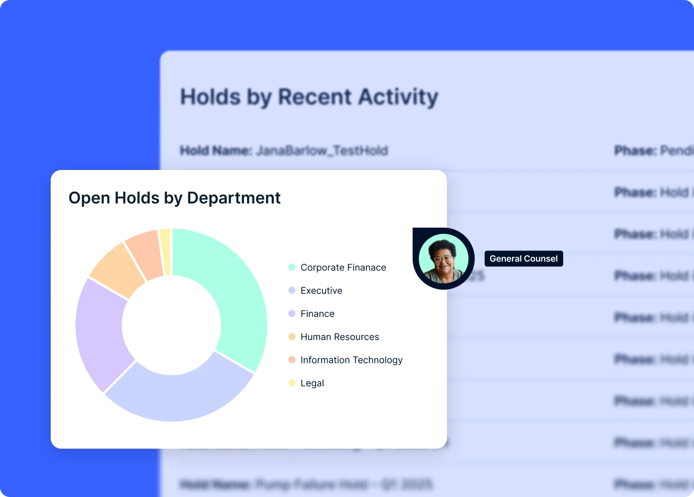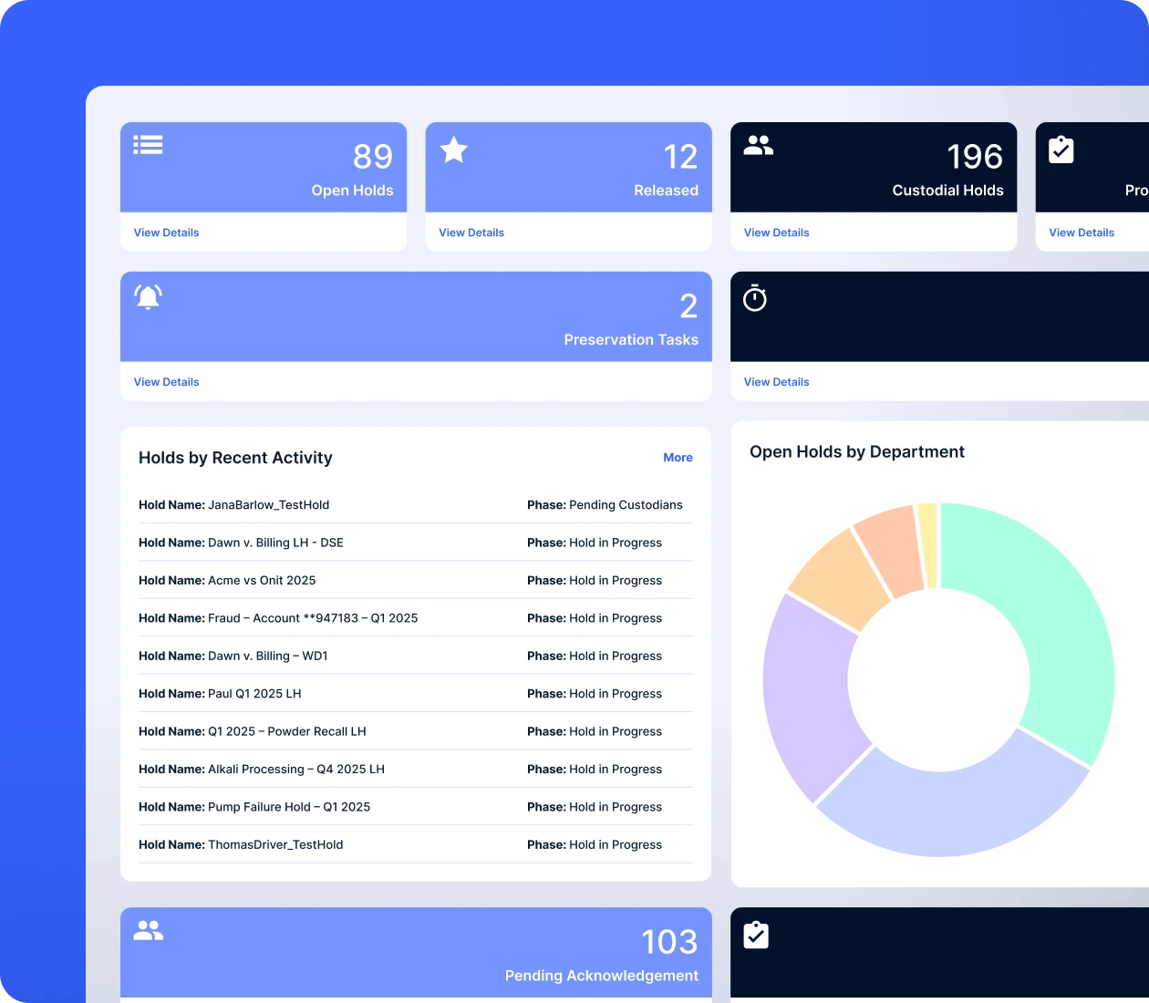 Get real-time insight into every legal hold. Configurable dashboards show hold status with drill-down details, giving leaders a clear view of compliance, risk, and exposure.