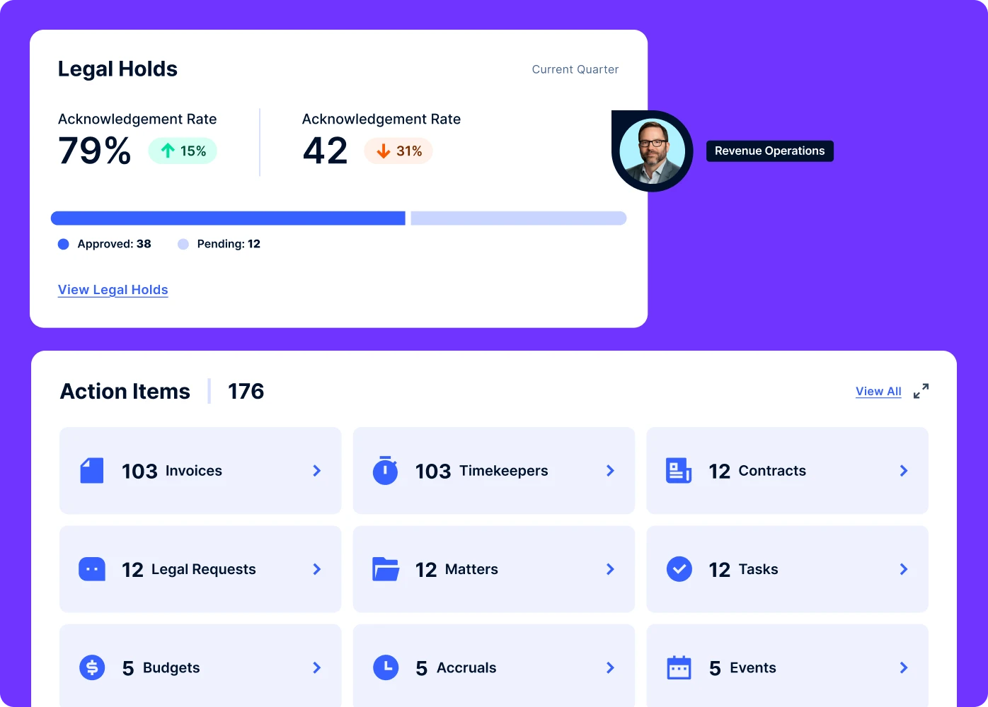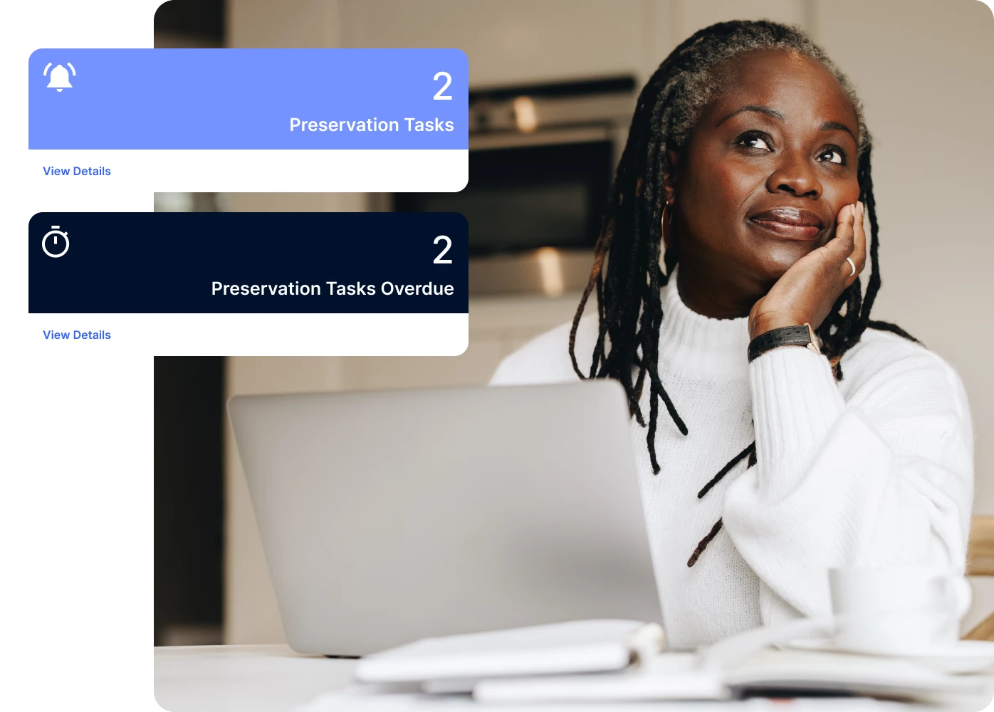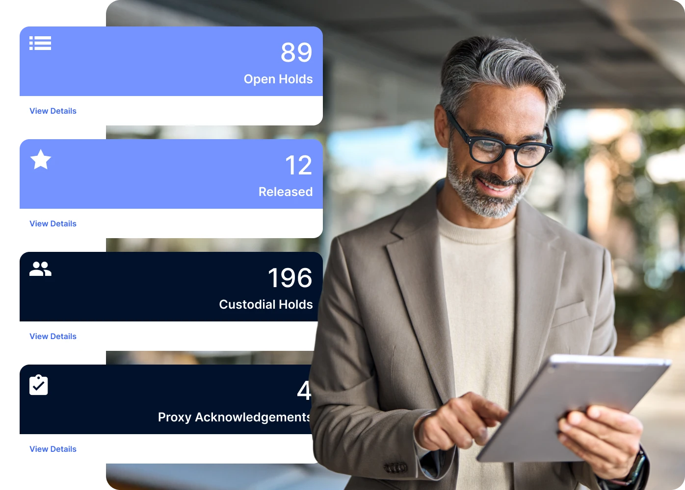 Get real-time insight into every legal hold. Configurable dashboards show hold status with drill-down details, giving leaders a clear view of compliance, risk, and exposure.