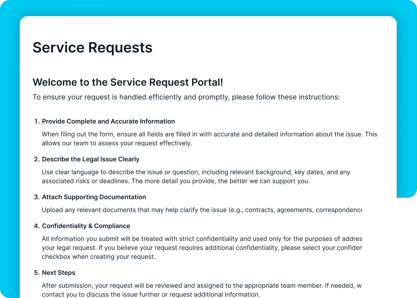 Legal Service Requests organizes all legal requests in one place, so nothing gets lost in emails or chat messages. Every request comes in structured, trackable, and easy to act on. That means faster response times for Legal and more clarity for the business.