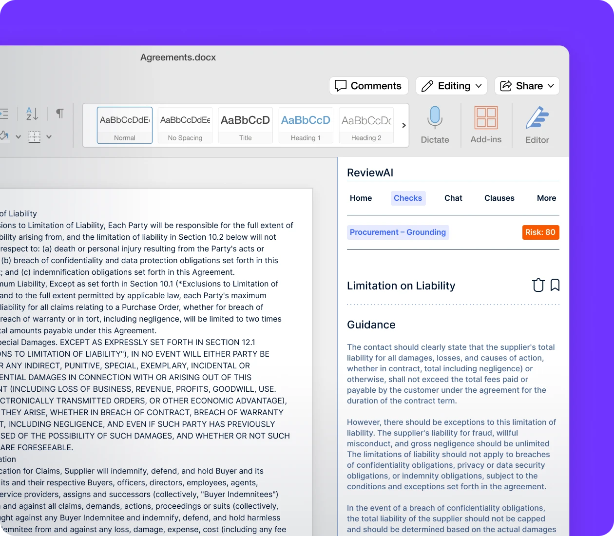 ReviewAI speeds up contract review with AI-native redlines and risk checks. Built-in playbooks and clause libraries keep every agreement consistent. By automating repetitive work, ReviewAI gives legal teams more time for high-value work such as shaping policies, managing risk, partnering with stakeholders, and guiding strategy. It also empowers business users by meeting them where they already work, directly within Microsoft Word.